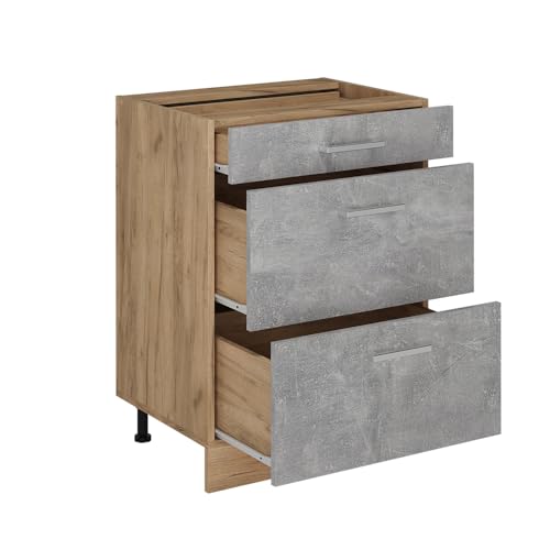 Vicco Mobiletto base per cucina R-Line, Calcestruzzo, 60 cm con cassetti, PL Rovere,