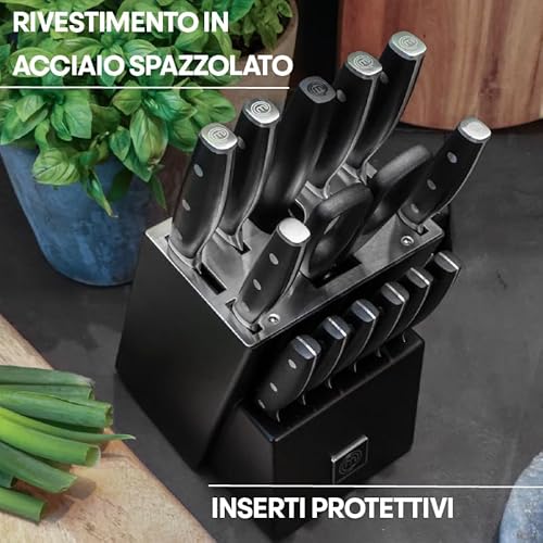 | componenti inclusi | Coltelli da cucina, ceppo, coltello pane, forbici, acciaio da affilatura |